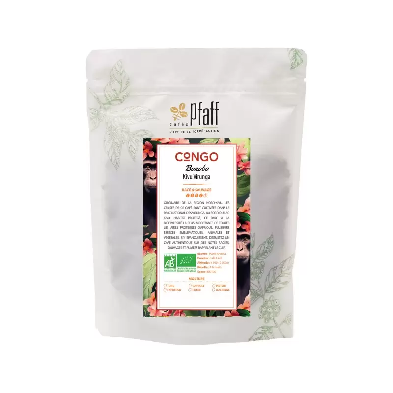Cultivé sans pesticide ou engrais chimiques, le café Bonobo a été certifié bio sur la période 2022-2023. Les caféiers évoluent à l’ombre des arbres de la jungle et à une altitude située entre 1 500 et 2 000 mètres. Récoltées à la main par de petits producteurs locaux, les cerises sont traitées par voie humide, dépulpées avec des machines traditionnelles puis triées.