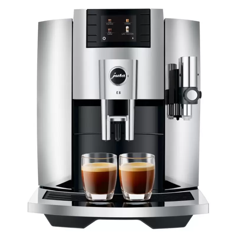 *En cas de rupture de stock de l’un des produits, nos équipes le remplaceront par un autre d’une valeur équivalente ou supérieure. *En cas de rupture de stock de l’un des produits, nos équipes le remplaceront par un autre d’une valeur équivalente ou supérieure. Nous voulons utiliser du … Café en grain et Café moulu Bac à eau ( en litre ) 1,9 Réservoir à grain en gr 280 Buse vapeur/eau chaude Oui Cappuccino & Latte Automatique – OTC Visuel écran TFT – Couleur Entretien automatique Oui Type de groupe Système PEP extraction pulsée Smart Connect Compatible Filtration Claris Smart Dimensions (L x H x P en CM) 28×34,60×44,40 Nous consommons … 15/20 tasses/jour Boissons programmables 17 Type de broyeur Professional Aroma Grinder Touches programmables 4 Niveau d’intensité café 10 niveaux Système de lait HP3 Compatible avec J.O.E.® Oui Wireless ready Oui Contrôle du bac d’égouttage Oui Couvercle protecteur d’arôme Oui Pulse Extraction Process (P.E.P.®) Oui Système de prépercolation intelligent (I.P.B.A.S.©) Oui Technologie mousse fine de JURA Oui Affichage du statut d’entretien Oui Programme intégré de rinçage, nettoyage et détartrage Oui Programme intégré de rinçage et de nettoyage du système de lait Oui Hygiène JURA certifiée TÜV Oui Mode d’économie d’énergie (Energy Save Mode, E.S.M.©) Oui Zero-Energy Switch ou interrupteur d’alimentation Zero-Energy Switch Quantité d’eau pour le café programmable et réglable individuellement Oui Température de l’eau chaude réglable (niveaux) 3 niveaux Heure d’extinction programmable Oui Ecoulement de café réglable en hauteur 65 – 111 mm Ecoulement Cappuccino réglable en hauteur 107 – 153 mm Longueur du câble (approx.) 1,1m Tension / Puissance 230 V ~ / 1450 W Intensité du courant 10 A Puissance en mode veille 0W Seconde sorte de café moulu Oui Boissons lactées Oui Poids 10 kg Largeur 28 cm Hauteur 34,60 cm Profondeur 44,40 cm Numéro d’article 15363 Code EAN 7610917153633 Cappuccino Lungo Barista Mousse de lait Expresso Doppio Expresso x2 Café spécial Expresso Macchiato Caffè Barista Latte Macchiato Flat White Ristretto x2 Eau chaude Thé Cafés x2 Cortado Description L’innovante E8 maîtrise 17 spécialités différentes, de l’espresso aromatique au cortado très en vogue. Les spécialités longues et douces comme le caffè Barista et le lungo Barista sont d’une qualité digne d’un bar à café. Un nouveau circuit de liquides les prépare dans la plus pure tradition barista. Pour les amateurs de café plus corsé, la fonction additionnelle Extra Shot donne un coup de fouet au cappuccino, au flat white et au latte macchiato.Grâce au circuit de liquides perfectionné, même le nettoyage du système de lait s’effectue automatiquement par simple pression d’une touche : une autre fonction empruntée aux lignes premium de JURA. L’E8 séduit également par son maniement encore plus intuitif et sa grande simplicité d’utilisation. Une qualité de café magistrale Le broyeur Aroma professionnel garantit 12,2 %* d’arôme en plus, une mouture de haute qualité et un déploiement idéal des saveurs pendant toute sa durée de vie. Le procédé d’extraction pulsée (P.E.P.®) offre des spécialités courtes au goût intense et le préchauffage intelligent assure une température optimale dès la première tasse. Une commande grand luxe Un visuel couleur 2,8″, six touches et un tout nouveau concept de commande avec intelligence artificielle assurent un maniement facile. Un algorithme intelligent détecte les préférences individuelles et affiche sur l’écran d’accueil les deux ou quatre spécialités favorites des utilisateurs de la machine. Les réglages produits et leur emplacement sur l’écran sont modifiables à souhait et on peut choisir d’afficher ou de masquer les noms de produits. Toutes les informations utiles sur la machine à café ainsi que les tâches d’entretien à réaliser sont clairement présentées dans le tableau de bord accessible depuis le visuel. Nettoyage One-Touch du système de lait Le nettoyage du système de lait se lance automatiquement par simple pression d’une touche. Le cycle bien pensé s’effectue en un tour de main. Le bac d’égouttage offre également une ergonomie optimale. Conçu pour éviter les débordements d’eau, il se retire facilement d’une seule main. Un design harmonieux Les machines automatiques à café JURA se distinguent par leur design net et expressif. Des matériaux haut de gamme et une finition précise soulignent l’excellence et la modernité de l’E8. Son esthétique respire la qualité, la fonctionnalité et la longévité. Des détails sophistiqués comme le réservoir d’eau rainuré ou la plate-forme pour tasses chromée parachèvent le design clair et harmonieux de l’E8.