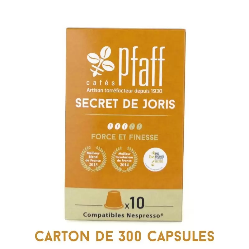 Variété botanique 100% Arabica Intensité du café Équilibré Répertoire aromatique Fort Répertoire aromatique Finesse Catégories Capsules Poids 2,70 kg Numéro d’article CAPSSJ-300 Conseils de dégustation : Expresso : 40mlRépertoire aromatique : Floral et boiséCaractère gustatif : HarmonieuxIntensité : 3/5 Best Of 2015 Gourmet SélectionLe lundi 7 septembre, le jury s’est réuni afin d’élire les 5 produits Best Of du salon sur 122 dossiers déposés et 40 produits sélectionnés.Le Secret de Joris en capsules compatibles Nespresso® a été sélectionné au concours BEST OF GOURMET SELECTION 2015.Ce concours , ouvert à tous les exposants, est le baromètre des tendances de l’épicerie fine et pour la première fois les prix seront décernés durant le salon. Nos capsules cafés sont compatibles avec tous les modèles de machines à café Nespresso®* *Marque appartenant à un tiers n’ayant aucun lien avec Cafés Pfaff